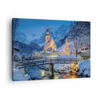 Schilderen op canvas - Winterlandschap met een kerk, brug en bergen in de schemering - 70x50cm - Kerstgeest - Moderne wanddecoratie voor woonkamer en slaapkamer ARTTOR