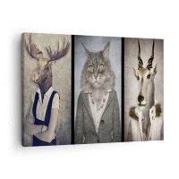 Schilderen op canvas - Een drieluik met dierfiguren in elegante kleding tegen een gestileerde achtergrond - 70x50cm - Bontjassen zijn weer in de mode - Moderne wanddecoratie voor woonkamer en slaapkamer ARTTOR