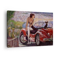 Schilderen op canvas - Een vrouw bij een rode auto met een stad op de achtergrond - 70x50cm - Zomer? Alleen aan de Rivièra - Moderne wanddecoratie voor woonkamer en slaapkamer ARTTOR