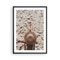 Poster in een zwarte lijst - Persoon zonnebadend op het strand, bovenaanzicht met een grote hoed tegen het zand - 50x70cm - De perfecte tijd - Moderne wanddecoratie voor woonkamer en slaapkamer ARTTOR