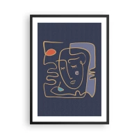 Poster in een zwarte lijst - Minimalistisch abstract gezicht op een marineblauwe achtergrond in lijnkunststijl - 50x70cm - In nadenken - Moderne wanddecoratie voor woonkamer en slaapkamer ARTTOR
