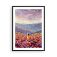 Poster in een zwarte lijst - Een lavendelveld met een vrouw die een hoed draagt tegen een bergachtergrond. - 50x70cm - In een lavendelwereld - Moderne wanddecoratie voor woonkamer en slaapkamer ARTTOR