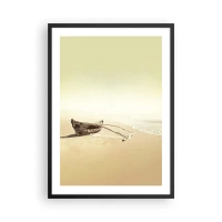 Poster in een zwarte lijst - Een eenzame houten boot op een leeg strand in pastelkleuren. - 50x70cm - Geheugen van de Stille Zuidzee - Moderne wanddecoratie voor woonkamer en slaapkamer ARTTOR