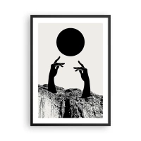 Poster in een zwarte lijst - Symbolische handen die naar een zwarte bal reiken tegen een achtergrond van rotsen - 50x70cm - Surrealistische compositie: de zon en de rest - Moderne wanddecoratie voor woonkamer en slaapkamer ARTTOR