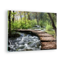 Schilderen op glas - Een houten brug over een stromende beek - 70x50cm - Boven de schuimige waterval - Moderne wanddecoratie voor woonkamer en slaapkamer ARTTOR