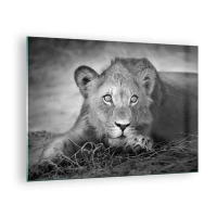 Schilderen op glas - Een leeuwenwelp in zwart-wit die in de camera staart - 70x50cm - Koninklijke puppy - Moderne wanddecoratie voor woonkamer en slaapkamer ARTTOR