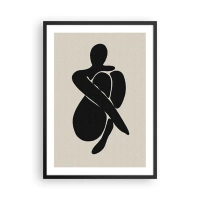 Poster in een zwarte lijst - Abstract figuur in een pose met armen om het lichaam geslagen, zwart-wit illustratie - 50x70cm - In je eigen armen - Moderne wanddecoratie voor woonkamer en slaapkamer ARTTOR