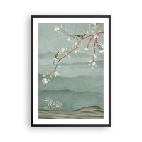 Poster in een zwarte lijst - Vogels op een bloeiende tak met uitzicht op de heuvels - 50x70cm - Lente, oh jij bent het - Moderne wanddecoratie voor woonkamer en slaapkamer ARTTOR