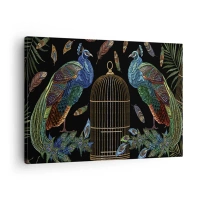 Schilderen op canvas - Pauwen naast een gouden kooi op een zwarte achtergrond - 70x50cm - In koninklijke gewaden - Moderne wanddecoratie voor woonkamer en slaapkamer ARTTOR