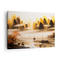 Schilderen op canvas - Een oosters landschap met een rivier, bergen en een zachte mist. - 70x50cm - Verder dan het Verre Oosten - Moderne wanddecoratie voor woonkamer en slaapkamer ARTTOR