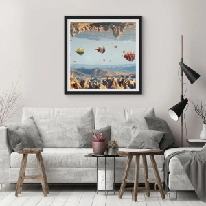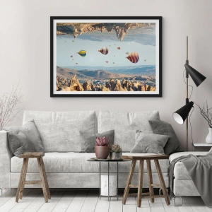 - Deze poster toont luchtballonnen die over rotsachtig terrein zweven. Perfect voor moderne interieurs. Inclusief zwarte lijst. Formaat: 50x70 cm.