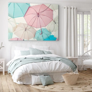 - Dit schilderij toont pastelkleurige paraplu's die tegen een heldere hemel zweven. De subtiele kleuren en delicate stijl maken het een ideale keuze voor romantische of moderne interieurs.