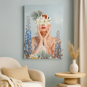 Bloemen symboliseren schoonheid en teerheid, en het expressieve portret van een vrouw voegt elegantie en karakter toe aan de gehele compositie. Details, zoals de intense kleuren van de bloemen en de subtiele lijnen van het gezicht, geven het schilderij diepte en expressiviteit, waardoor het een ideale keuze is voor wie van verfijnde wanddecoraties houdt.