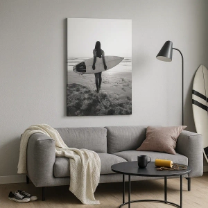 - Dit zwart-wit schilderij toont een vrouw met een surfplank op een strand. Een stijlvolle en minimalistische compositie, perfect voor moderne interieurs geïnspireerd door natuur en beweging.