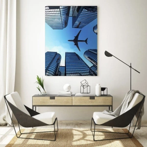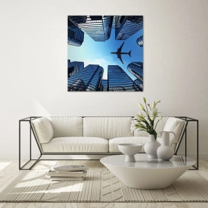 - Deze glasprint toont een vliegtuig dat over moderne wolkenkrabbers vliegt. Perfect voor interieurs met een moderne en minimalistische stijl.