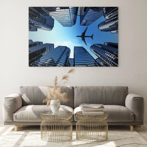 Schilderen op glas - Uitzicht op het vliegtuig tussen wolkenkrabbers - 70x50cm - Het uitzicht vanuit het glazen ravijn - Moderne wanddecoratie voor woonkamer en slaapkamer ARTTOR