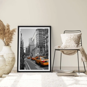 - De poster toont drukke straten vol gele taxi's tegen een achtergrond van monochrome architectuur. Het is de perfecte decoratie voor liefhebbers van stedelijke stijl en dynamische interieurs.