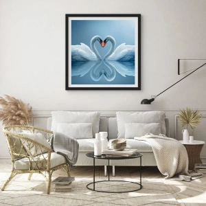- Deze poster toont twee zwanen in de vorm van een hart op kalm water met een blauwe achtergrond. Perfect voor romantische en elegante interieurs. Het product wordt geleverd met een zwarte lijst van 50x70 cm.