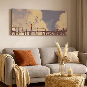 - Dit schilderij toont een persoon staand op een brug tussen de wolken, omringd door vogels tegen een blauwe lucht. Een delicate en inspirerende compositie die perfect is als decoratie voor elk interieur.