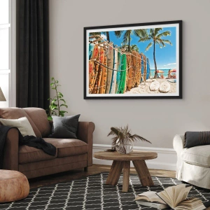 - Deze poster toont surfplanken op een tropisch strand met palmbomen en een blauwe lucht. Perfect voor zomer- en vakantie-interieurs, geleverd met een elegante zwarte lijst.