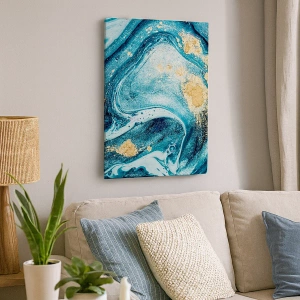 - Het schilderij toont abstracte golven van blauwe en gouden accenten. Perfect voor interieurs die waarde hechten aan elegantie en een onderscheidende esthetiek.