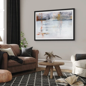 Poster in een zwarte lijst - Een abstracte compositie met tinten grijs, wit en goud. - 50x70cm - Achter de luchtgordijn - Moderne wanddecoratie voor woonkamer en slaapkamer ARTTOR