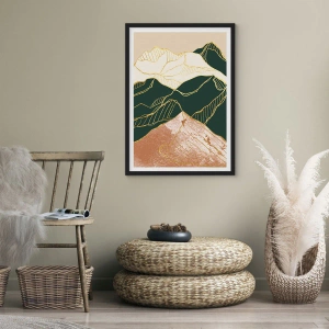 "Golden Peaks" is een elegante poster die elementen van abstractie combineert met een natuurlijk landschap. Het toont gestileerde bergen getekend met gouden lijnen, wat de compositie een unieke elegantie en harmonie geeft. De kleuren diepgroen, warm bruin en delicaat beige creëren een samenhangend, vredig geheel.