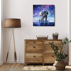 De wandklok "Sterrenhemel Boven Mij" is een uniek decoratief element dat ons meeneemt naar de mysterieuze wereld van de ruimte. De wijzerplaat toont een astronaut in volledige uitrusting, tegen de achtergrond van een intens kleurrijk sterrenstelsel met fonkelende sterren.