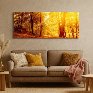 - Een schilderij van een herfstopen plek met een bospad in goudgeel zonlicht. Een sfeervolle en pittoreske compositie die de harmonie en schoonheid van de natuur in het interieur brengt.