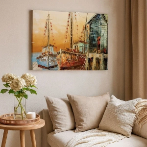 Het canvas wordt over het frame gespannen. De zijkanten en randen zijn bedrukt en zetten het beeld voort. De schilderij is klaar om aan de muur te hangen. Elk product heeft een hanger aan het frame en een montagekit (schroef + pin).
