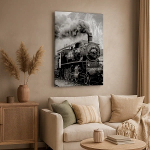• Spoorweg, locomotief, passagierstrein, Zwart en wit, Automotive, Reizen, Vintage en retro, Voor op kantoor, voor de studeerkamer, voor de eetkamer, voor de hal, voor de woonkamer, voor de slaapkamer, Grijs, zwart en wit, Verticaal