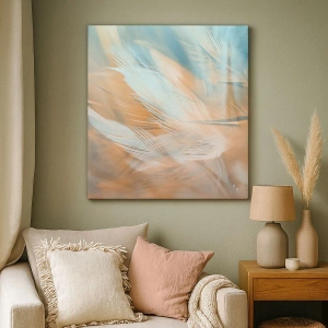 Canvasschilderij "In het land van zachtheid" is een unieke compositie die de kijker meeneemt naar een wereld van delicatesse en harmonie. Het toont subtiele veren in pasteltinten blauw en oranje, die een lichte en luchtige compositie creëren. Deze decoratie brengt een sfeer van rust en subtiliteit in het interieur.