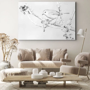 Schilderen op canvas - Vogel op een tak in zwart-wit met een minimalistische stijl - 70x50cm - Winterochtend - Moderne wanddecoratie voor woonkamer en slaapkamer ARTTOR