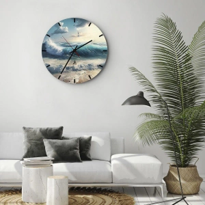 - Een klok met een schilderachtige afbeelding van woeste oceaangolven die tegen de kust klotsen. De compositie combineert de dynamiek van water met de subtiliteit van licht en ruimte, waardoor een rustgevend, inspirerend landschap ontstaat.