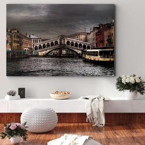 De canvasprint "Belofte van een Venetiaanse avond" toont een van Venetië's meest herkenbare symbolen: de Rialtobrug die zich uitstrekt over het pittoreske Canal Grande. Dit landschap, vastgelegd in warme, gedempte kleuren, legt het unieke karakter van de historische architectuur en de sfeer van de Italiaanse stad van de geliefden vast.