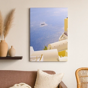 "Grieks landschap in wit en blauw" is een schilderachtig schilderij op canvas dat traditionele Griekse architectuur met uitzicht op de blauwe zee afbeeldt. De kenmerkende geel-witte gebouwen met koepels en een zeilboot op het kalme wateroppervlak creëren een harmonieuze en ontspannende compositie. Perfect voor liefhebbers van reizen en het mediterrane klimaat.