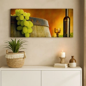 Druiven op een houten vat met een fles en een glas wijn op de achtergrond is een elegant schilderij dat een sfeer van warmte, traditie en harmonie in het interieur brengt. De compositie combineert elementen uit de natuur met een rustieke stijl, wat een sfeervol decoratief accent creëert.
