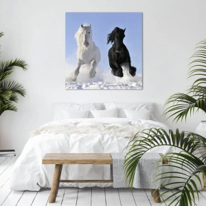 "Zwart-witte galop" is een uniek schilderij dat een dynamische scène afbeeldt met een wit en zwart paard dat galoppeert in een besneeuwd landschap. Het contrast tussen de dieren symboliseert de harmonie van tegenstellingen en hun beweging straalt kracht, vrijheid en elegantie uit, wat karakter toevoegt aan het interieur.