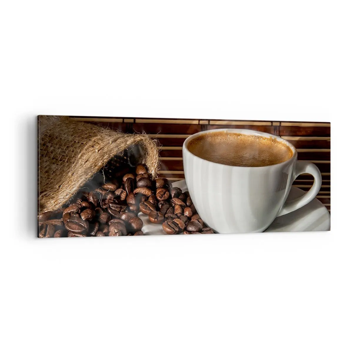 Het canvas wordt over het frame gespannen. De zijkanten en randen zijn bedrukt en zetten het beeld voort. De schilderij is klaar om aan de muur te hangen. Elk product heeft een hanger aan het frame en een montagekit (schroef + pin).