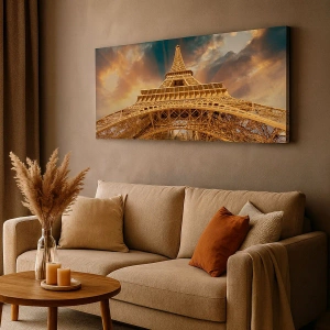 - Het schilderij toont de majestueuze Eiffeltoren van onderaf, omlijst door de gouden stralen van de ondergaande zon. Een uniek uitzicht op het symbool van Parijs in al zijn glorie, perfect voor moderne interieurs.