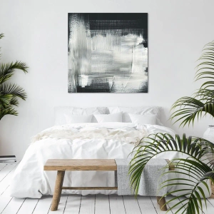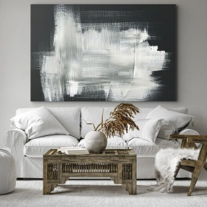 Canvaskunst "Witte abstracte strepen op een donkere achtergrond" is een kunstwerk dat de aandacht trekt met zijn eenvoud en moderne stijl. Het centrale motief bestaat uit witte penseelstreken, die een effectief contrast vormen met het donkere oppervlak en de harmonie en subtiliteit van de compositie benadrukken.
