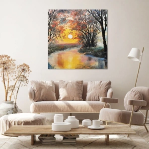 De canvasprint "Herfstsfeer" toont een betoverend herfstlandschap, waarin de zonsondergang een kalme rivier verlicht, omringd door bomen in warme tinten oranje, geel en rood. Het straalt rust en harmonie uit en legt de charme van de herfstnatuur perfect vast. De reflecties van het licht op het water voegen diepte en pittoreskheid toe aan de compositie.