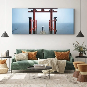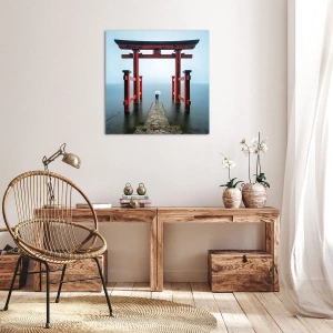 - Dit sfeervolle schilderij toont een toriipoort met uitzicht op een rustig, in mist gehuld meer. Een ideale keuze voor wie waarde hecht aan zen en harmonie in interieurdesign.
