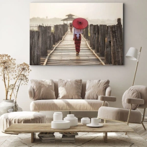 Het canvas wordt over het frame gespannen. De zijkanten en randen zijn bedrukt en zetten het beeld voort. De schilderij is klaar om aan de muur te hangen. Elk product heeft een hanger aan het frame en een montagekit (schroef + pin).