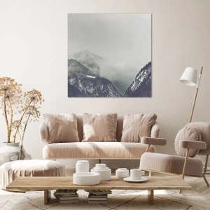 - Dit sfeervolle schilderij toont een bergdal gehuld in grijze mist. Een minimalistische compositie die rust en harmonie in het interieur brengt.