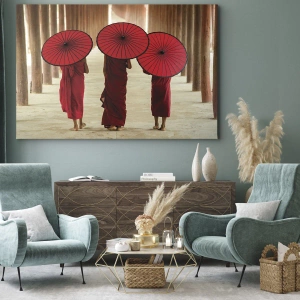 - Dit schilderij toont drie monniken met rode paraplu's, omringd door traditionele architectuur. Een decoratief element dat harmonie en spiritualiteit in interieurs brengt.
