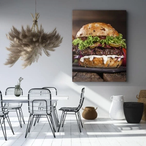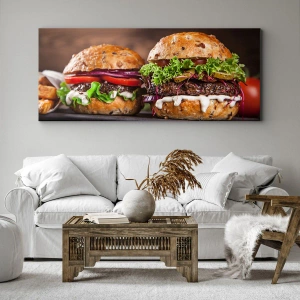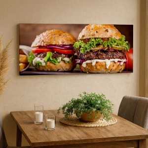 - Dit schilderij toont smakelijke hamburgers met groenten en saus tegen een rustieke achtergrond. Perfect voor fijnproevers, het voegt een heerlijke sfeer toe aan de keuken of eetkamer.