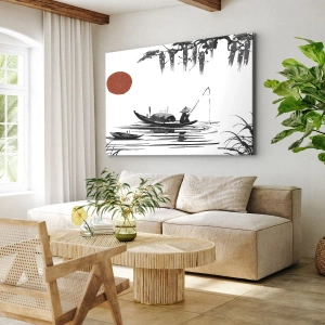 Het schilderij straalt harmonie en vrede uit en voert de kijker mee naar een schilderachtige wereld geïnspireerd door de oosterse traditie. De eenvoudige maar expressieve vorm benadrukt de schoonheid van de natuur en de symboliek van leven in harmonie met de natuur. Het motief van een visser en een boot op het water roept een traditionele levensstijl en meditatieve reflectie op.
