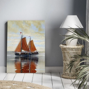 • Zeilboot, Zee, Landschap, Landschappen, Maritiem, Landschappen, Reizen, Voor op kantoor, voor de studeerkamer, voor de eetkamer, voor de badkamer, voor de hal, voor de woonkamer, voor de slaapkamer, Rood, oranje, grijs, Verticaal