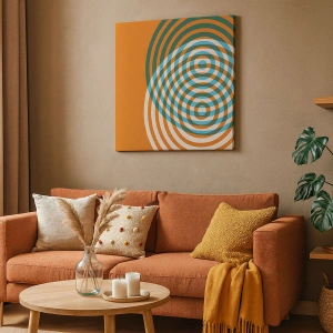 - Dit moderne ontwerp toont concentrische cirkels tegen een achtergrond van tinten oranje, blauw en groen. Perfect voor moderne en minimalistische interieurs.